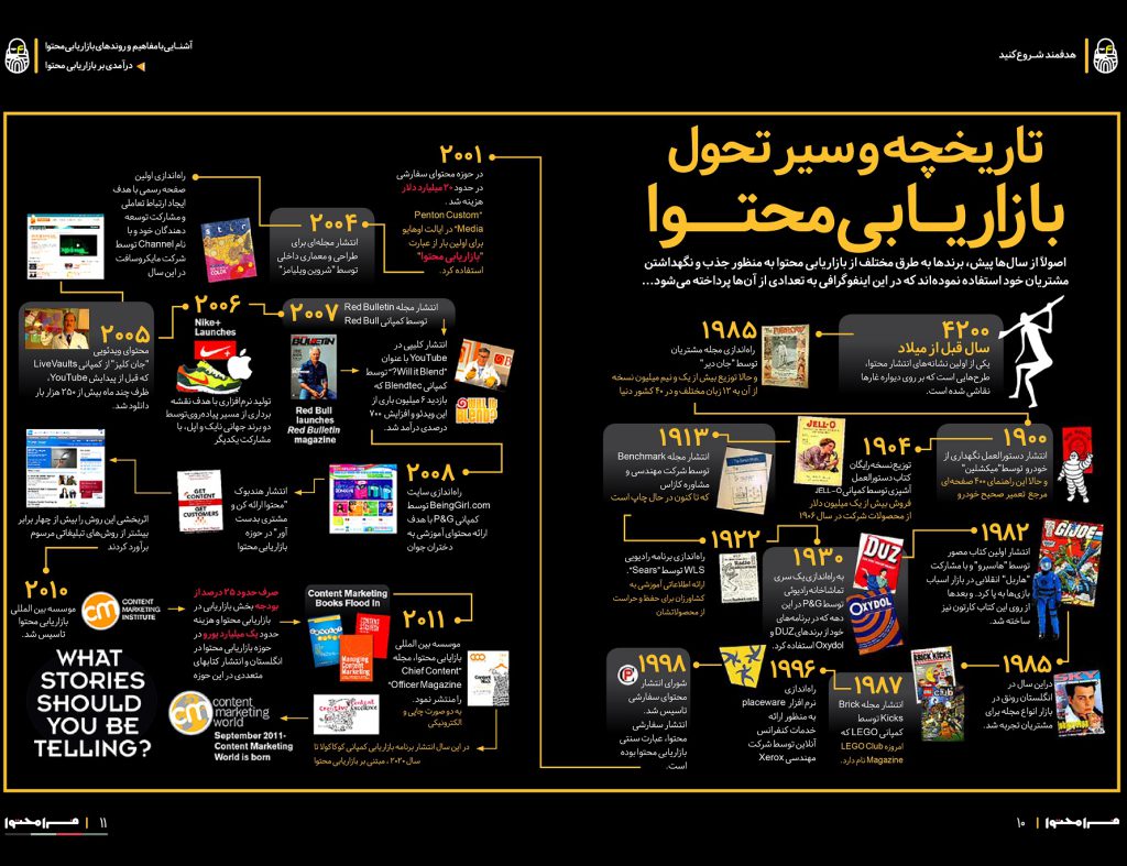 بازاریابی محتوا یکی از روشهای بازاریابی است که در میان مدت و بلندمدت منجر به ایجاد ارزش برای یک کسی و کار یا فروشگاه اینترنتی میشود. بررسیها نشان میدهد که درصد قابل توجهی از بازاریابان از بازاریابی محتوا استفاده میکنند؛ زیرا ین نوع از بازاریابی در حقیقت یک استراتژی بلندمدت است که بر ایجاد یک رابطه قوی با مخاطب هدف متمرکز است و تلاش میکند با دادن محتوای با کیفیت به مخاطبان با آنها ارتباط برقرار سازد. بازاریابی محتوا طی چند قرن گذشته راه زیادی را طی کرده است. بسیاری از شرکتهای بزرگ جهان همچون شرکت مایکروسافت و سیسکو از این روش بازاریابی استفاده میکنند. البته بازاریابی محتوا تنها به کسب و کارها و شرکتهای بزرگ اختصاص ندارد؛ بلکه کسب و کارهای کوچک و حتی فروشگاههای یک نفره ای هم در سراسر جهان وجود دارند که از طریق بازاریابی محتوا کسب و کارشان را توسعه دادهاند. رویکرد این شاخه از بازاریابی استراتژیک است و بر ایجاد و توزیع محتوای با ارزش تمرکز دارد.محتوایی که بتواند به جذب مخاطب بینجامد و در نهایت با مشتری به سوی یک کسب و کار، سودآور باشد. زمانی که مشتریان تصمیم به خرید میگیرند، به هرحال به عوامل مختلفی توجه میکنند و یکی از این عوامل که شاید مهمترین آنها نیز محسوب شود، احساسی است که مشتریان نسبت به یک برند دارند. بازاریابی محتوا سعی دارد در طول یک فرآیند مشخص احساس مشتریان را بهگونهای شکل دهد که آنها در بین برندهای مختلف نسبت به یکی از آنها تعهد و وفاداری بیشتری داشته باشند. اگرچه اینترنت و رسانههای اجتماعی بستر اصلی بازاریابی محتوا محسوب میشوند، اما این شاخه از بازاریابی صرفاً به حوزه دیجیتال محدود نمیشود؛ هنوز هم برخی از شرکتها هستند که از طریق تولید محتوای آفلاین فعالیتهای بازاریابی محتوا را پیش میبرند. بازاریابی محتوا در مفهوم کلی به معنای به اشتراک گذاری دانش، مشاوره و سرگرمی در یک قالب قابل استفاده است که این قالب ممکن است شامل مقالات وبلاگ، فیلم، پادکست، بازاریابی از طریق رسانههای اجتماعی، ایمیلها، وبینارها، اینفوگرافیک، کاریکاتور، مسابقه و آزمون، ارزیابیها، برنامهها و غیره باشند. در بخش بعد با تاریخچه بازاریابی محتوا آشنا خواهیم شد.