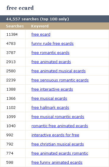ابزارهای مناسب گوناگونی برای این کار موجود است برای مثال با استفاده از Wordtracker و جستجوی کلمه مورد نظر (برای مثال free ecard) نتایجی شبیه به عکس زیر به شما نمایش میدهد که در آن تعداد جستجوی ماهانه برای کلمه مورد نظر توسط کاربران و همچنین کلمات کلیدی پیشنهادی دیگری قابل مشاهده است. برای مثال کلمه کلیدی free ecard در هر روز 11384 بار و نتیجتا 347201 بار در ماه نمایش داده میشود.