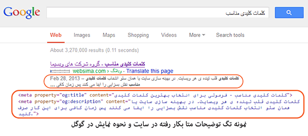 خیر، گوگل تعداد زیادی از تگهای متا را میشناسد، بعنوان مثال تگ توضیحات متا بعنوان محتوایی که در نتایج گوگل نشان داده میشود استفاده میشود. تصویر زیر نمایی از این مثال را نشان میدهد: