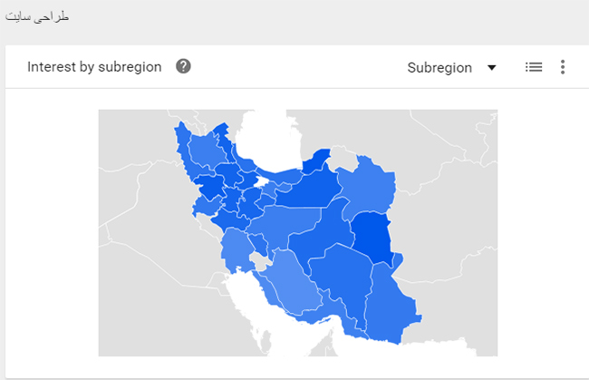 گوگل ترند می تواند داده های مرتبط با جستجو را بر اساس هر ناحیه تقسیم بندی می کند. همانطور که در شکل زیر مشاهده می کنید، موضوع طراحی سایت در سراسر ایران محبوبیت دارد و جستجوهای بسیاری را به خود اختصاص داده است. بیشترین میزان جستجوی این عبارت در دو سال گذشته از استان خراسان جنوبی بوده است.