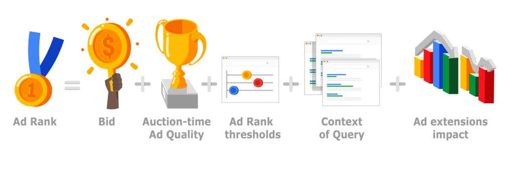 گوگل از سیستم مزایده برای رتبه بندی آگهی هایی که در صفحه نتایج گوگل ظاهر میشوند و همچنین برای تعیین هزینه هر کلیک استفاده میکند.